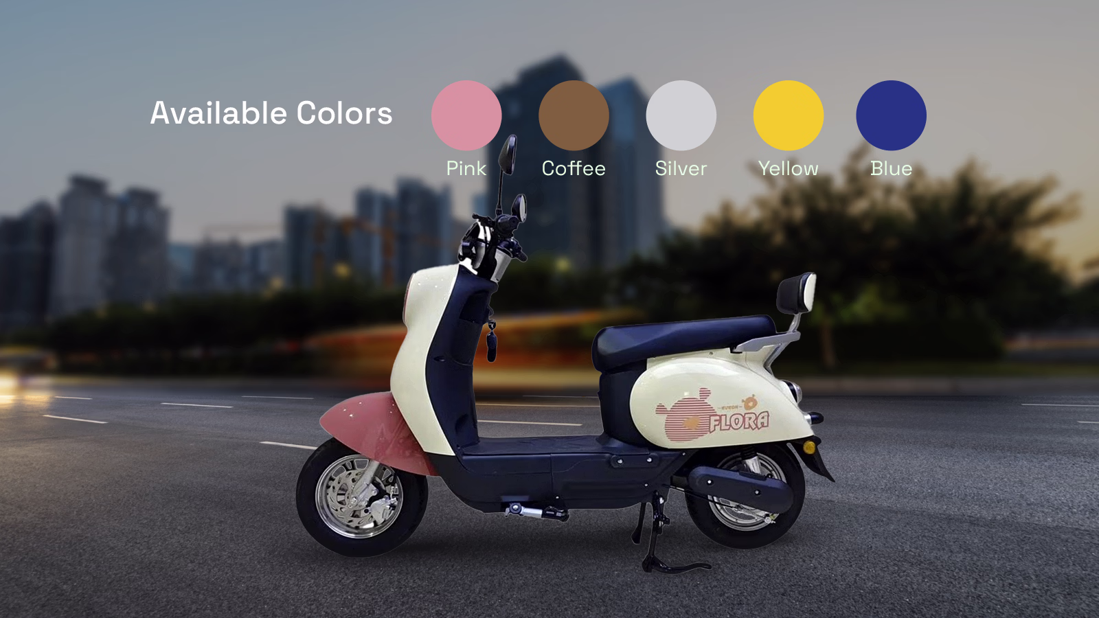 a perfect fusion of smart technology, comfort, and safety. Designed for everyday riders, Flora comes equipped with reverse gear for easy maneuvering, cruise control for relaxed long rides, and a side stand sensor for added safety. Its front disc and rear drum brakes deliver confident stopping power, while 10-inch tubeless tyres on sleek alloy rims ensure a stable and puncture-resistant ride. With features like keyless on/off, a modern digital meter, and an anti-theft alarm system, Eveon Flora keeps you in control—securely and stylishly. Backed by a 24-month motor warranty and 18-month coverage on the battery and controller, this is an electric scooter that’s built for the long run.